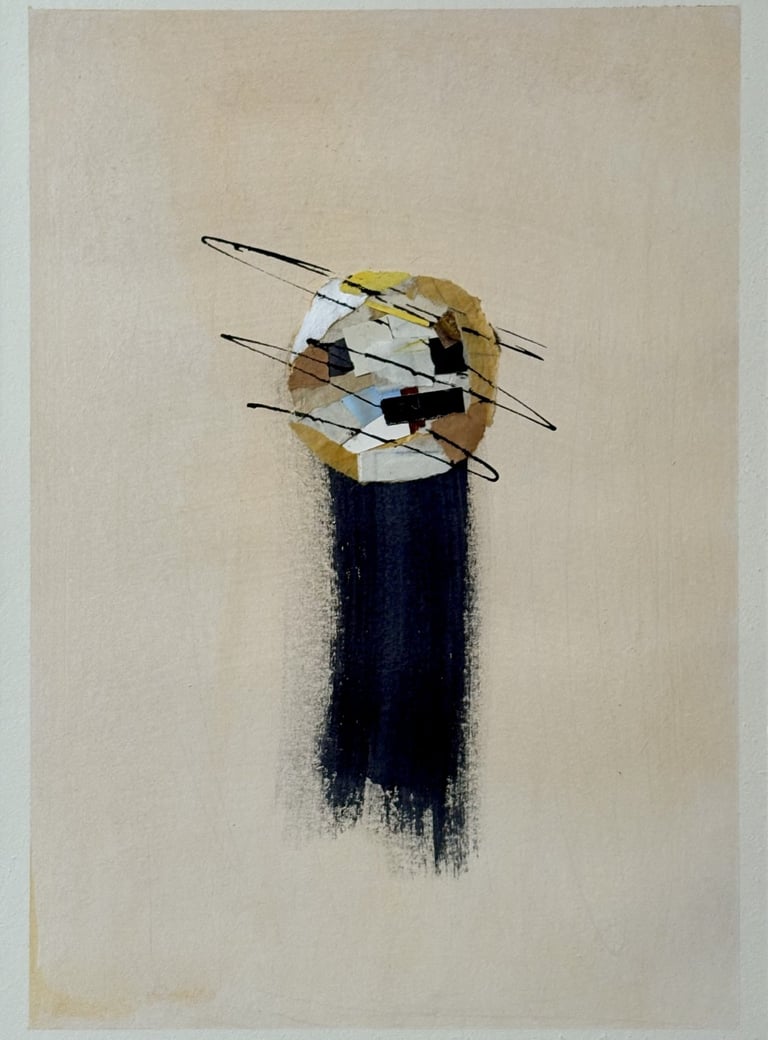 The Fragments series comprises three works (42cm x 30cm), on 350 gsm watercolour paper, each exploring the breakdown and reconstruction of visual information. By juxtaposing collaged geometric shards with raw gestural marks, Burrell interrogates how disparate experiences (the fragments) coalesce into a unified visual statement. The series moves from the tightly structured Fragments 1 toward increasingly dispersed compositions in the subsequent pieces, tracing an evolution from order to dissolution. The minimalist empty space in each work serves as a canvas for the viewer's own interpretation of the fragmented narrative.