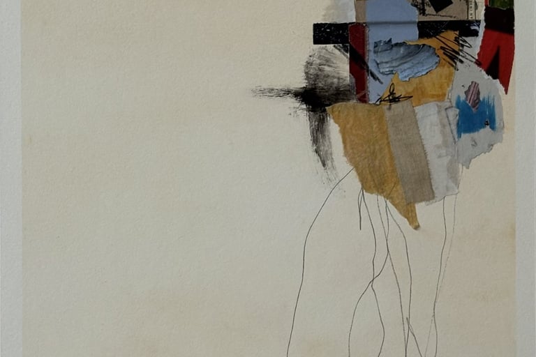 Below the collage, thin, wavering pencil lines extend downward, implying movement or the lingering traces of an unseen form. The left side of the paper remains a plain, off-white surface, emphasising spatial emptiness and allowing the fragmented composition to become a focal point of introspection.