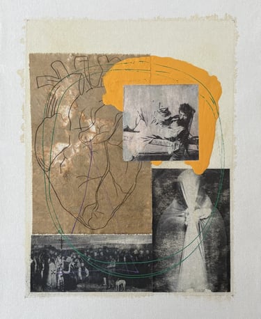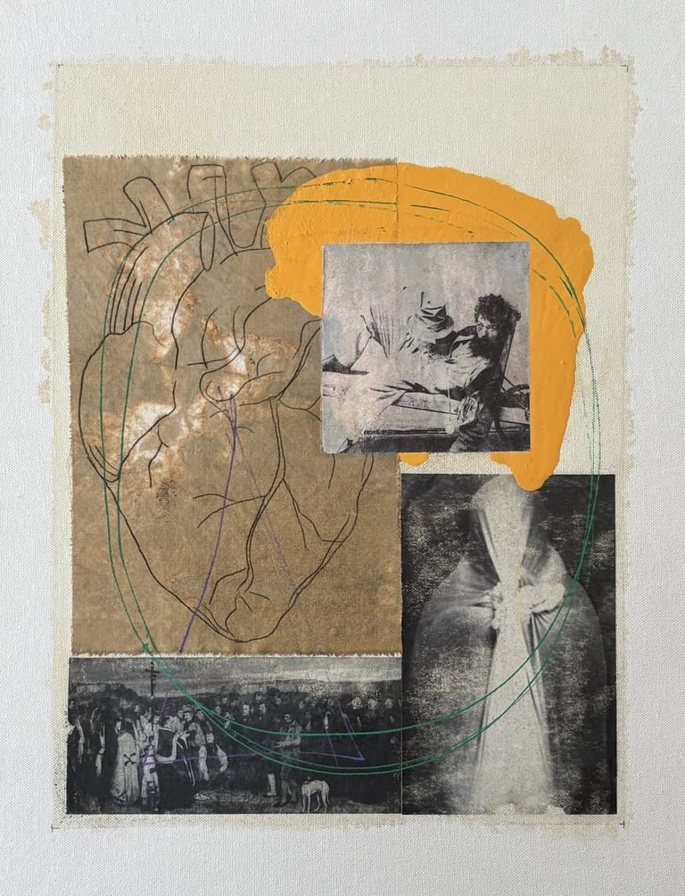 Burrell builds upon this with several distinct elements: Anatomical Heart: A large, linear drawing of a human heart on what appears to be aged, semi-translucent fabric. The lines are precise, almost like a diagram, but its placement as the central figure gives it a powerful emotional weight. Image Transfers & Collage: He then skillfully employs image transfers and collage elements to integrate what look like black-and-white reproductions of older images. We see a historical funeral crowd scene by Courbet, a mysterious shrouded figure, and a Victorian drunk. These fragments feel like borrowed memories or glimpses into different eras of human experience, their transferred nature giving them a ghostly, dreamlike quality. The Burst of Colour: A bold, almost aggressive swipe of thick, opaque marigold-yellow paint dominates the upper-middle portion of the canvas. This is the most assertive "brushstroke" in the piece. Its sheer physicality contrasts sharply with the flat, transferred images beneath it, creating a dynamic focal point that both obscures and unifies. Connecting Threads: Thin, gestural lines of green and purple gracefully weave across the canvas, looping around the different elements. They act like a neural network or a map, visually stitching together the heart, the crowd, and the ghostly figure, suggesting a hidden relationship between them all.